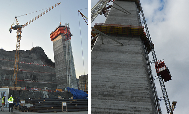 Kule vinçlerin yanı sıra şantiye içinde bulunan STROS marka 4 dış cephe asansörü, 24 saat boyunca köprü ayaklarının inşaatında kullanılan hareketli beton kayar kalıplarına her seferde 25 kişiyi ya da 2000 kg. yükü, 4 dakikada 320 metre yüksekliğe taşıma kapasitesiyle projeye büyük katkı sağlıyor.