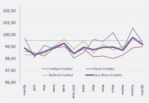 Ağustos ayında Beklenti Endeksi, Temmuz’daki pozitif değerinden negatif tarafa kayarken, Güven Endeksi ise eşik değerin altında kaldı. Böylece sektörün geleceğe dair beklenti ve güveni hâlâ sınırlı bir düzeyde. Birleşik Hazır Beton Endeksi de diğer göstergelerdeki düşüşe paralel olarak gerileyerek uzun süredir aşılamayan eşik değerin altına indi.